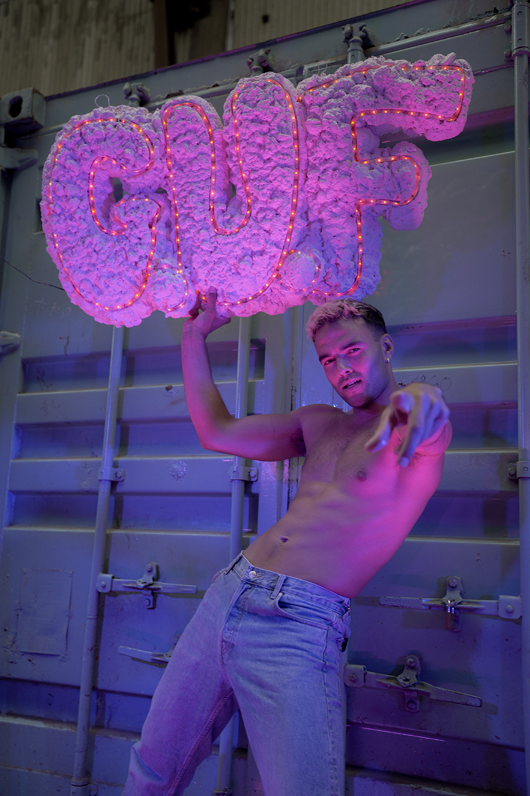 Vi skabte deres ikoniske G.U.F skilt, som både blev brugt under skydningen af teasere samt blev kronen på værket i den slikbutikken vi skabte.