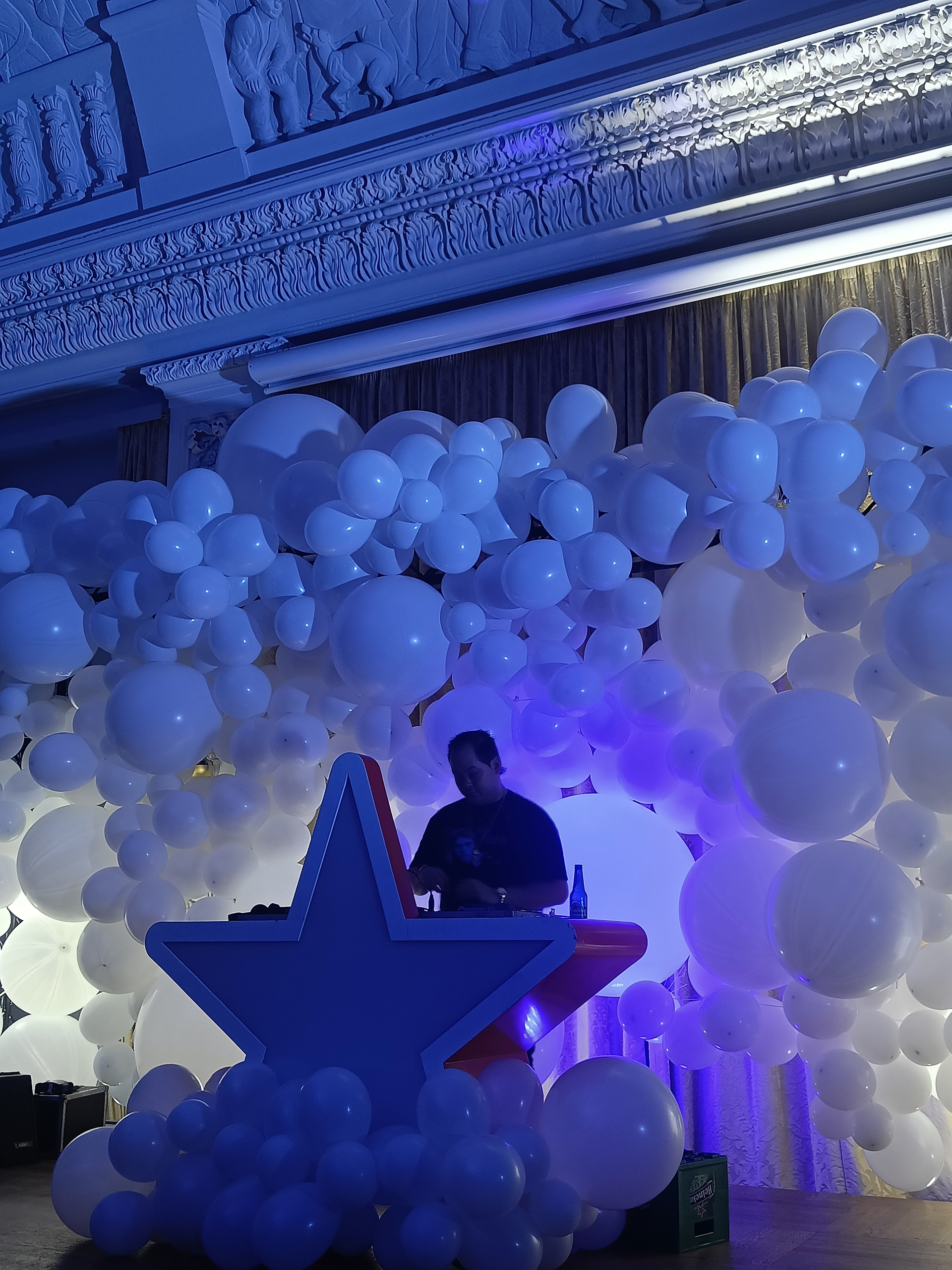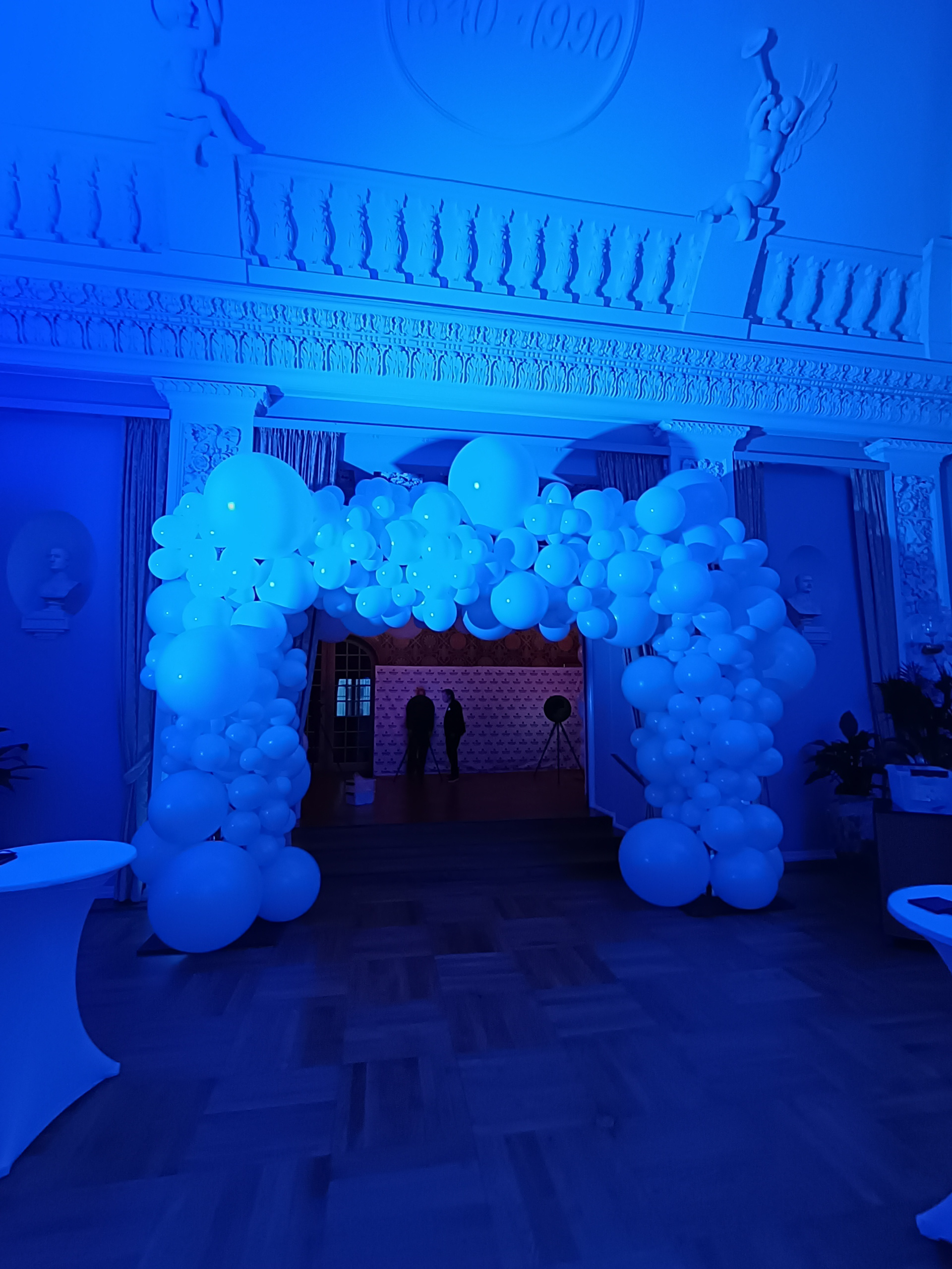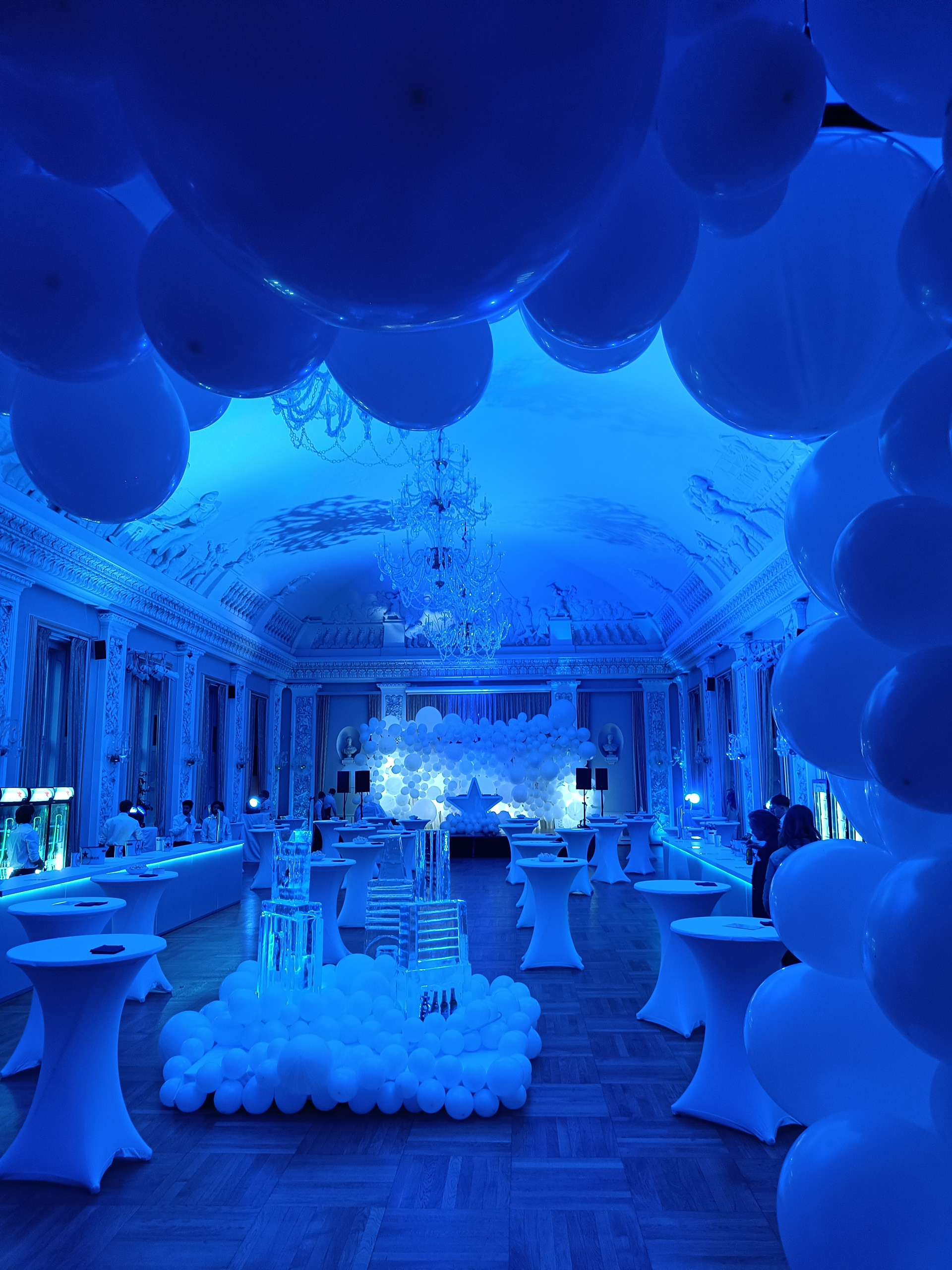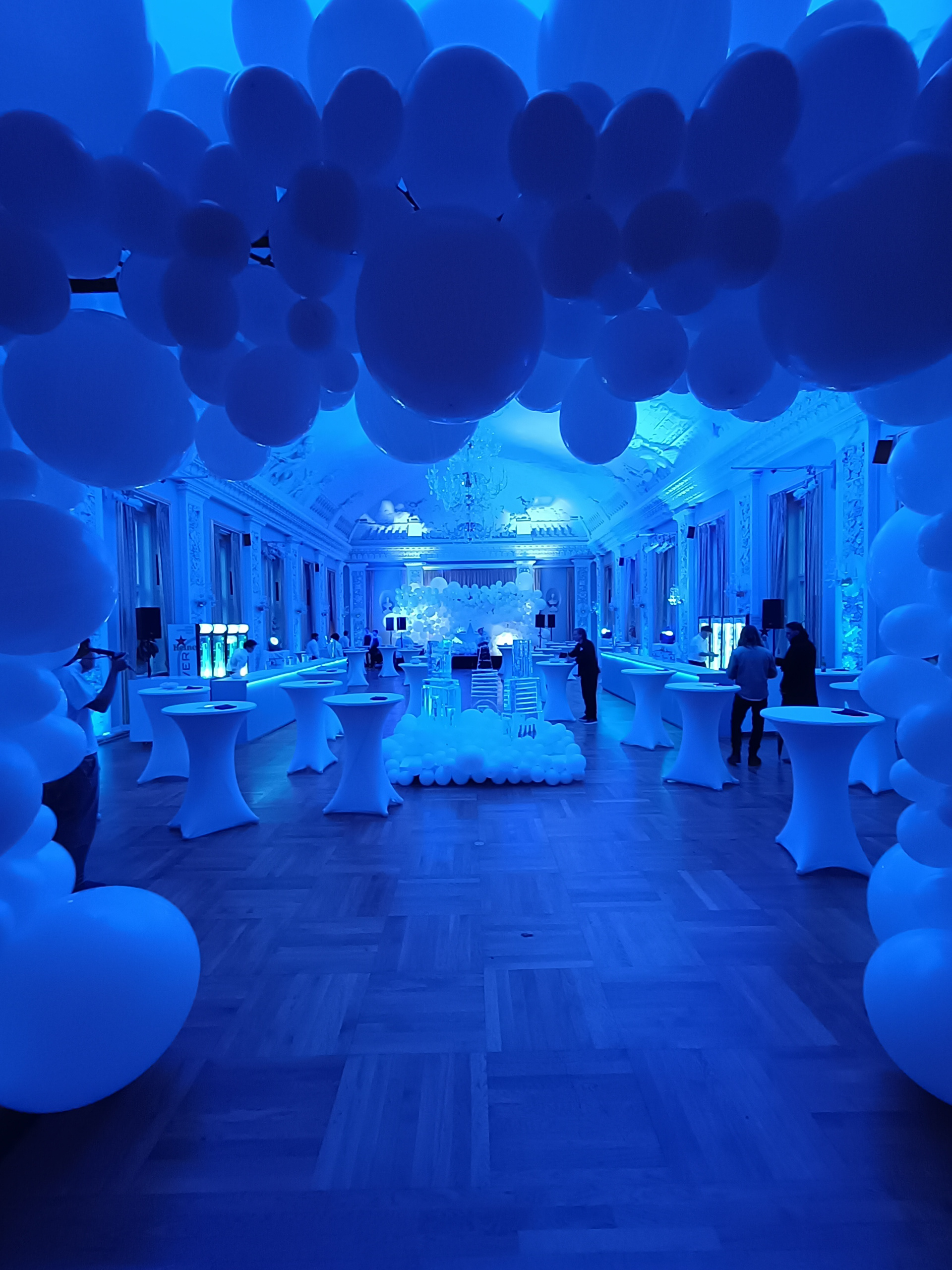 Monokrom Ballon installation der skaber fyldig, elegant og dynamisk atmosfære.